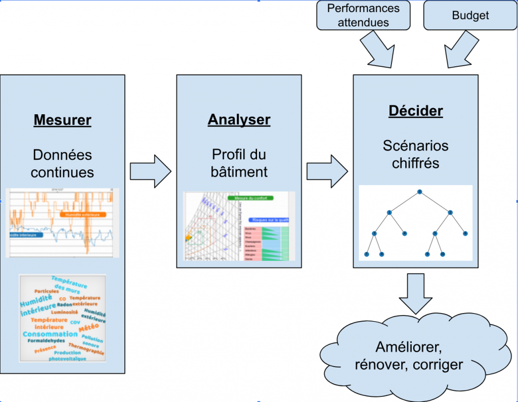Nous travaillons sur le terrain réel et pas seulement sur la théorie. Nous mesurons et analysons les critères physiques du bâtiment pour le comprendre et en déterminer son profil avec ses forces et ses faiblesses.